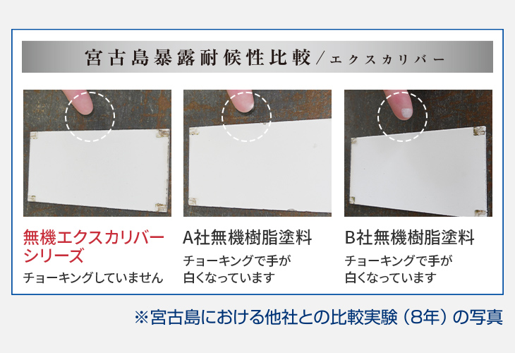 無機エクスカリバーシリーズは、紫外線や雨・風、塩害など過酷な気象条件に強いという大きなメリットがあります。