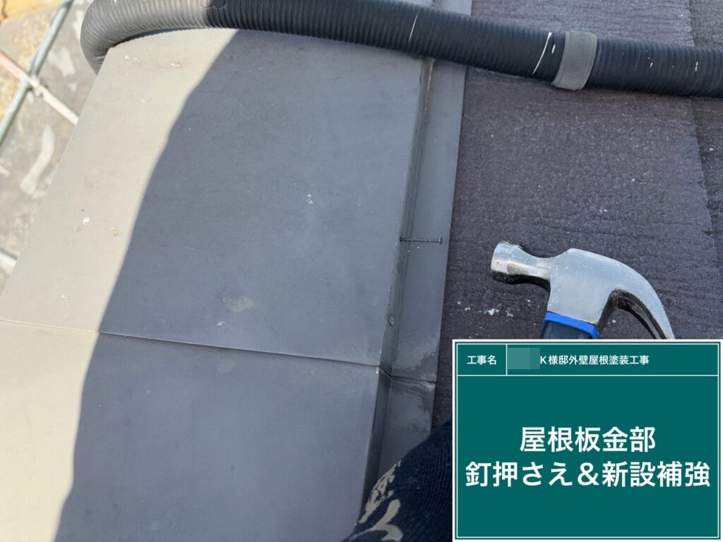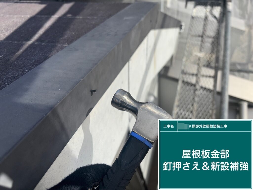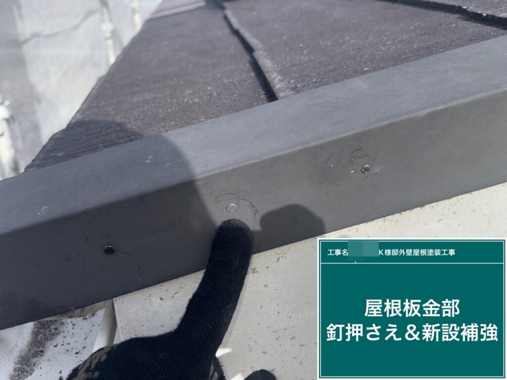 屋根鈑金部のビスの緩み戻しと新設補強を行います。