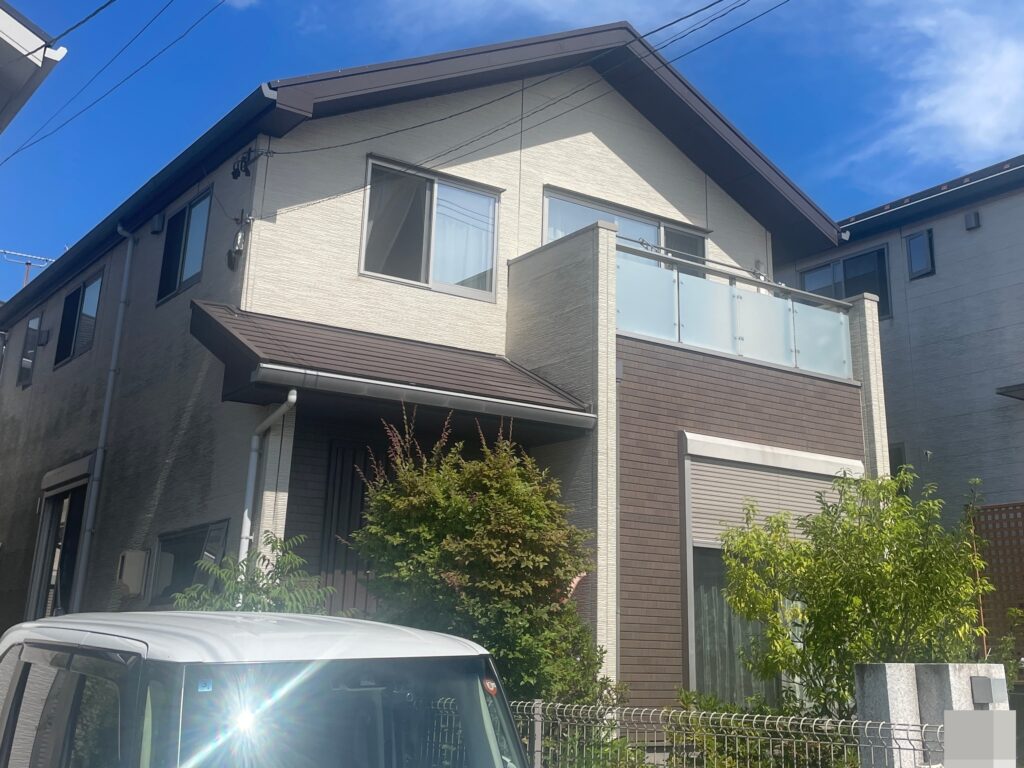 Y様のお宅は、築15年、住友林業さんのお家の初めての外壁屋根塗装工事となります。外壁に関しましては経年劣化に伴うチョーキング現象、コーキングの劣化が目立ちメンテナンスの必要がありました。窯業系サイディングボードの外壁で、洗浄(下地調整)後、下塗りを施し主材塗料にて中塗り・上塗りを行います。特にバルコニー壁や西面の壁は日当たりが良く、膨張収縮が起こり続けております。タイル部分はクリアー塗装にて施工させていただきます。