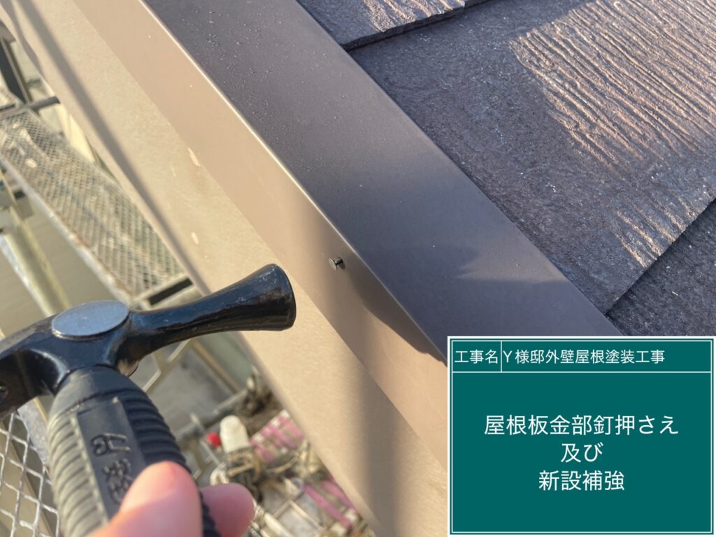 屋根に関しましては、薄型スレート瓦(無石綿スレート/カラーベスト等)です。板金部にサビ止めを塗布後、屋根塗料にて塗装致します。合わせてタスペーサー(縁切り)設置も行います。